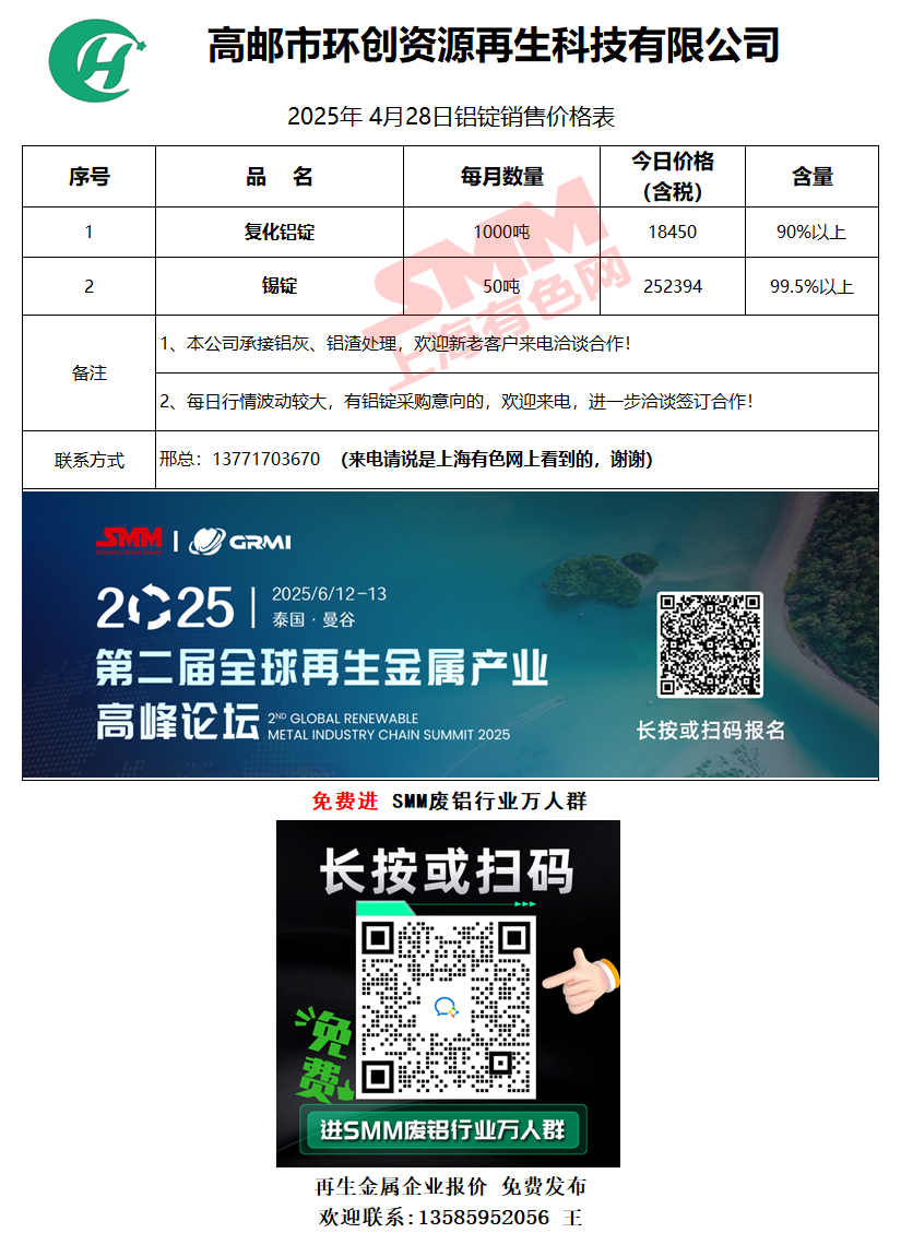 4月28日高邮环创铝业 废铝销售报价