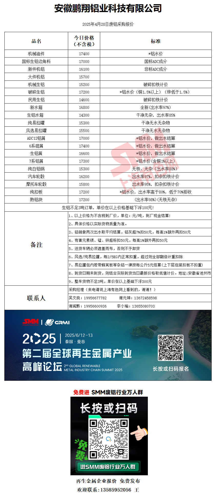 今日安徽鹏翔 废铝采购报价已更新,有货的朋友欢迎联系我们!