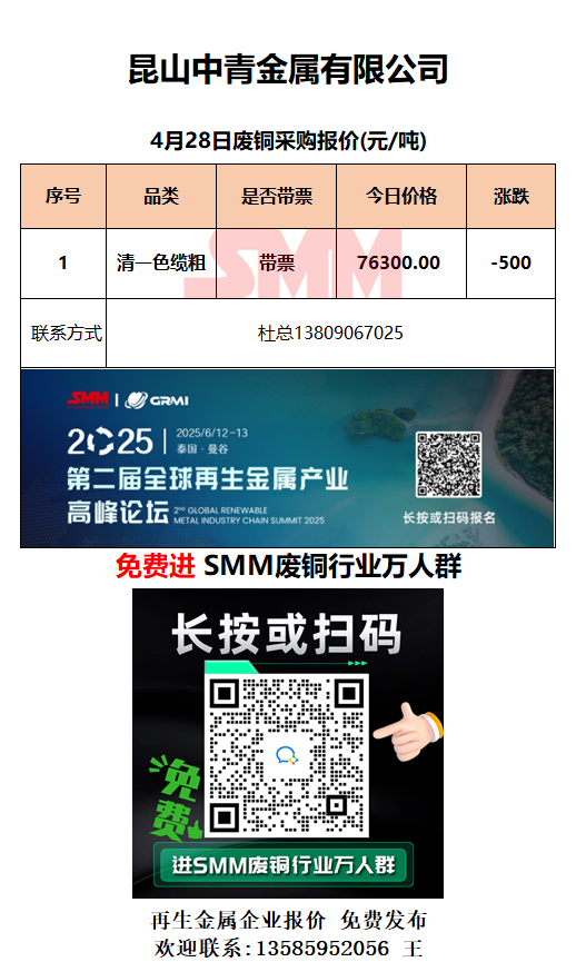4月28日昆山中青 废铜采购报价