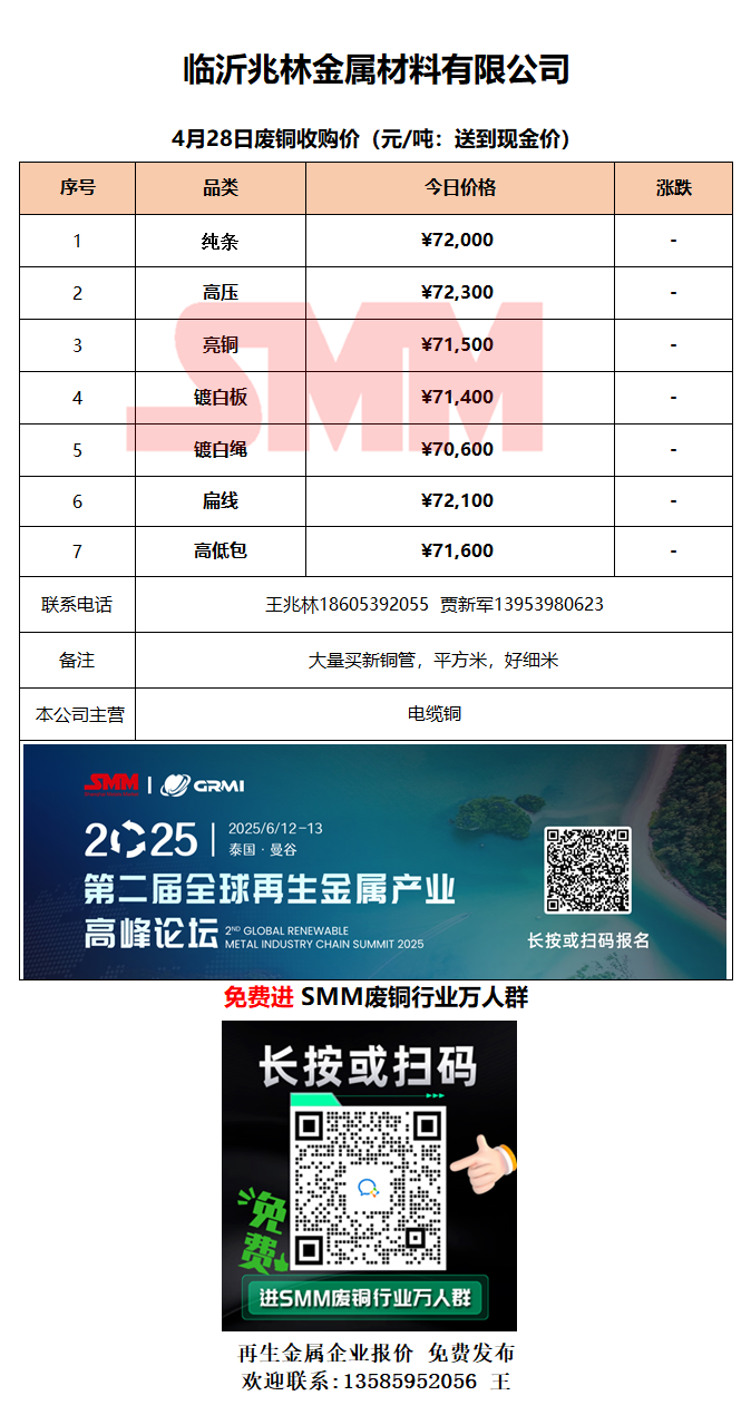 今日临沂兆林金属 废铜采购报价已更新,有货的朋友欢迎联系我们!