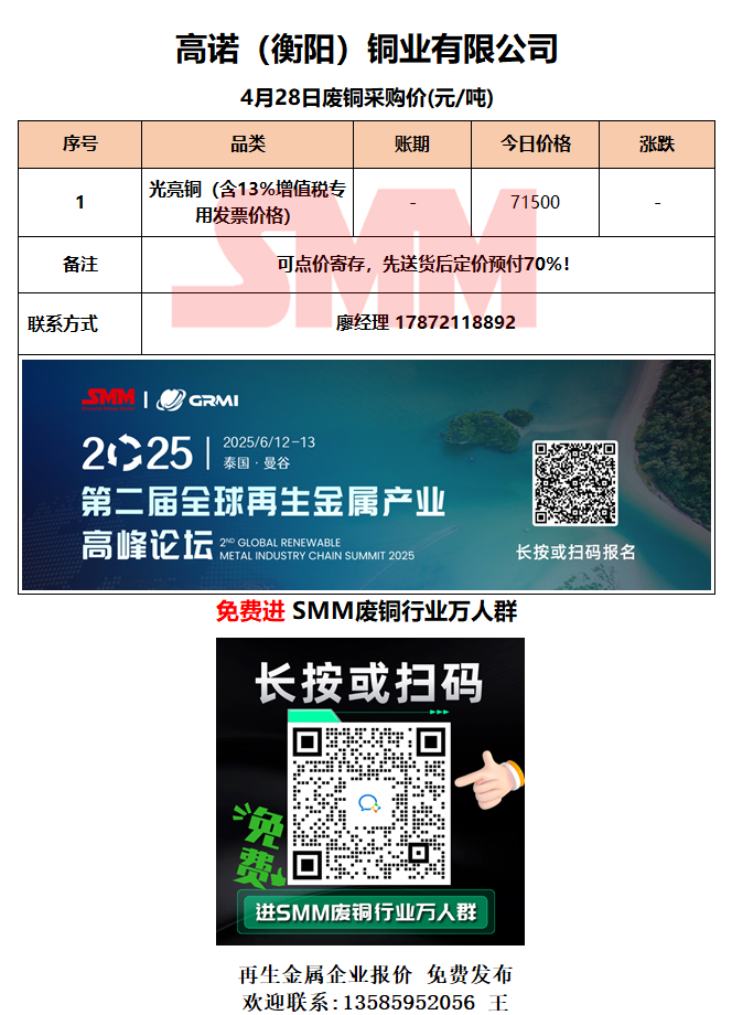 4月28日高诺(衡阳)铜业 废铜采购报价
