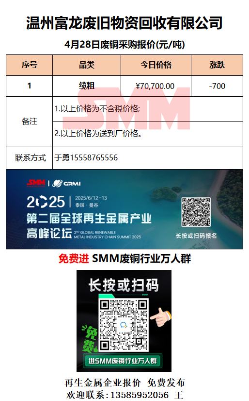 4月28日温州富龙废旧 废铜采购报价