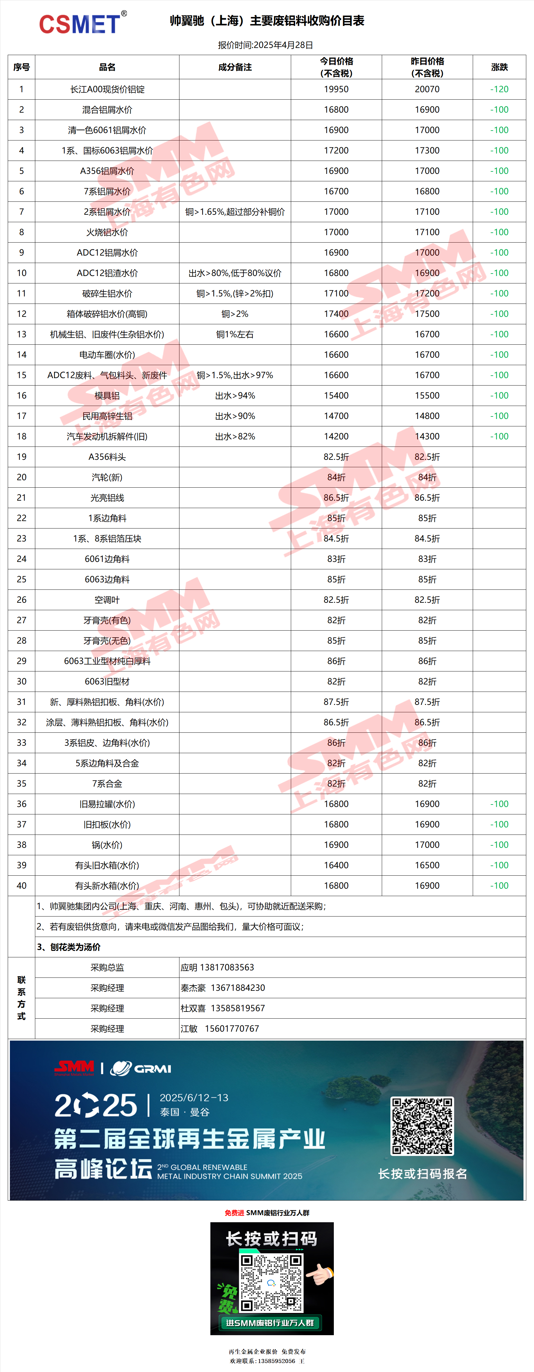今日帅翼驰(上海) 废铝采购报价已更新,有货的朋友欢迎联系我们!