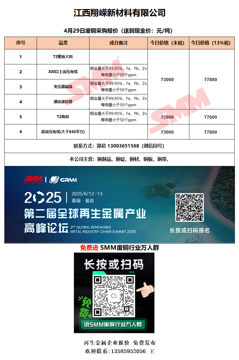今日江西翔嵘新材料 废铜采购报价已更新,有货的朋友欢迎联系我们!