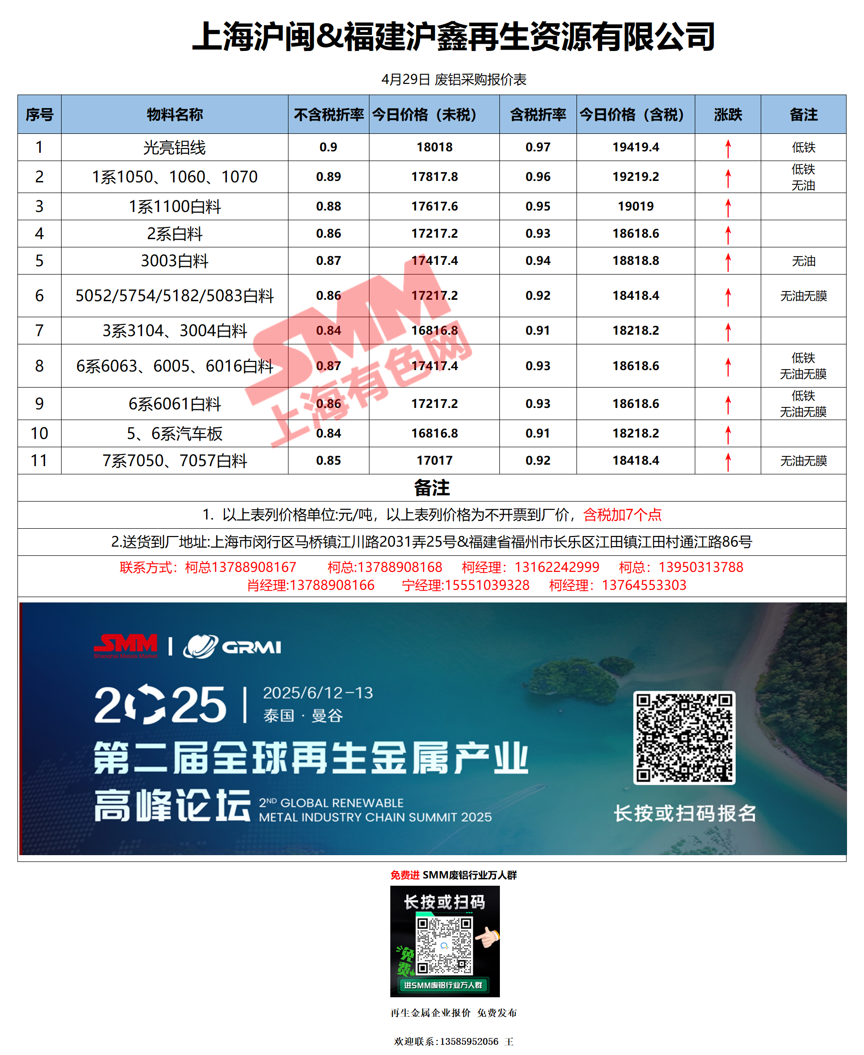4月29日上海沪闽&福建沪鑫 废铝采购报价