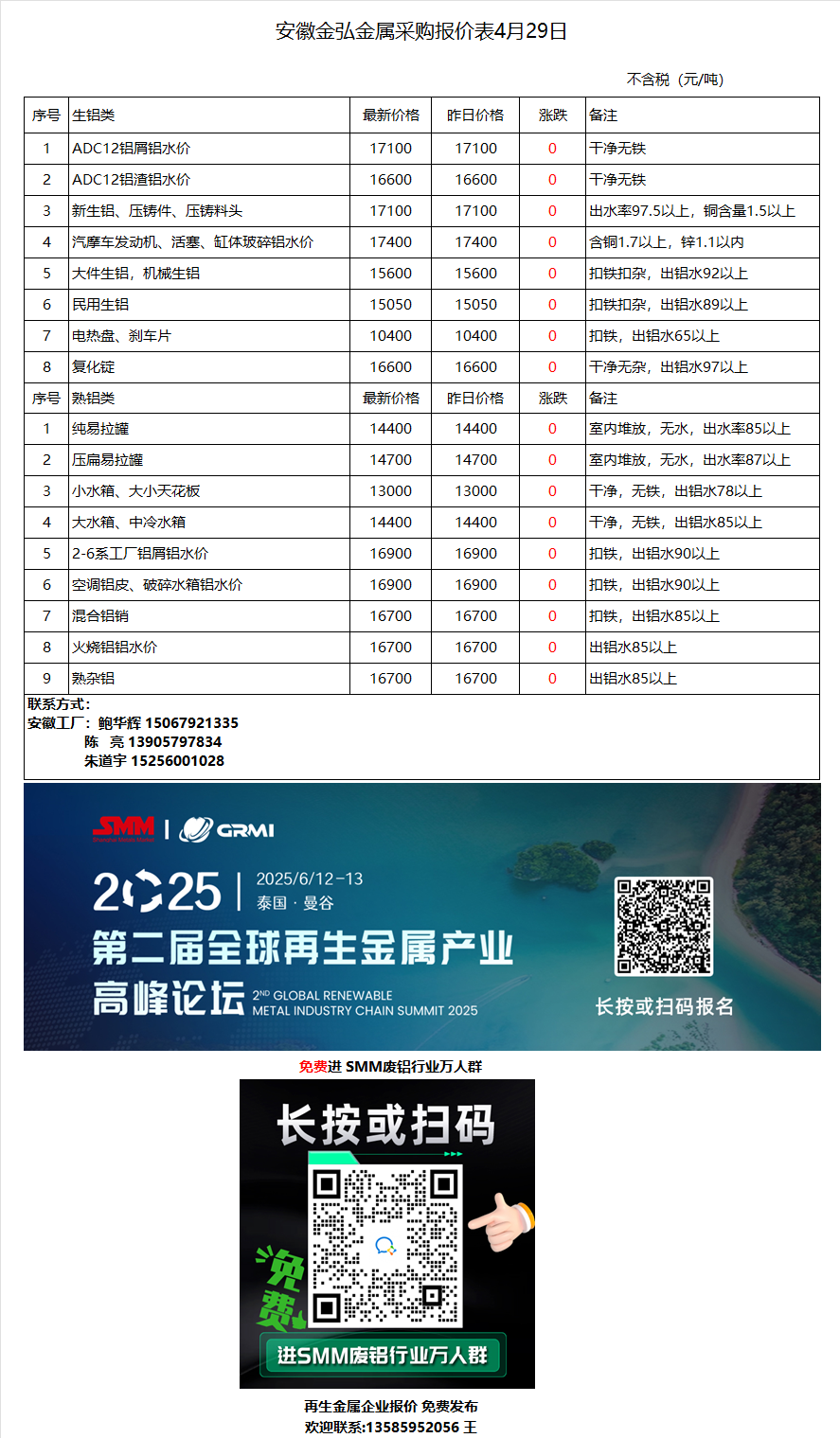 4月29日安徽金弘 废铝采购报价