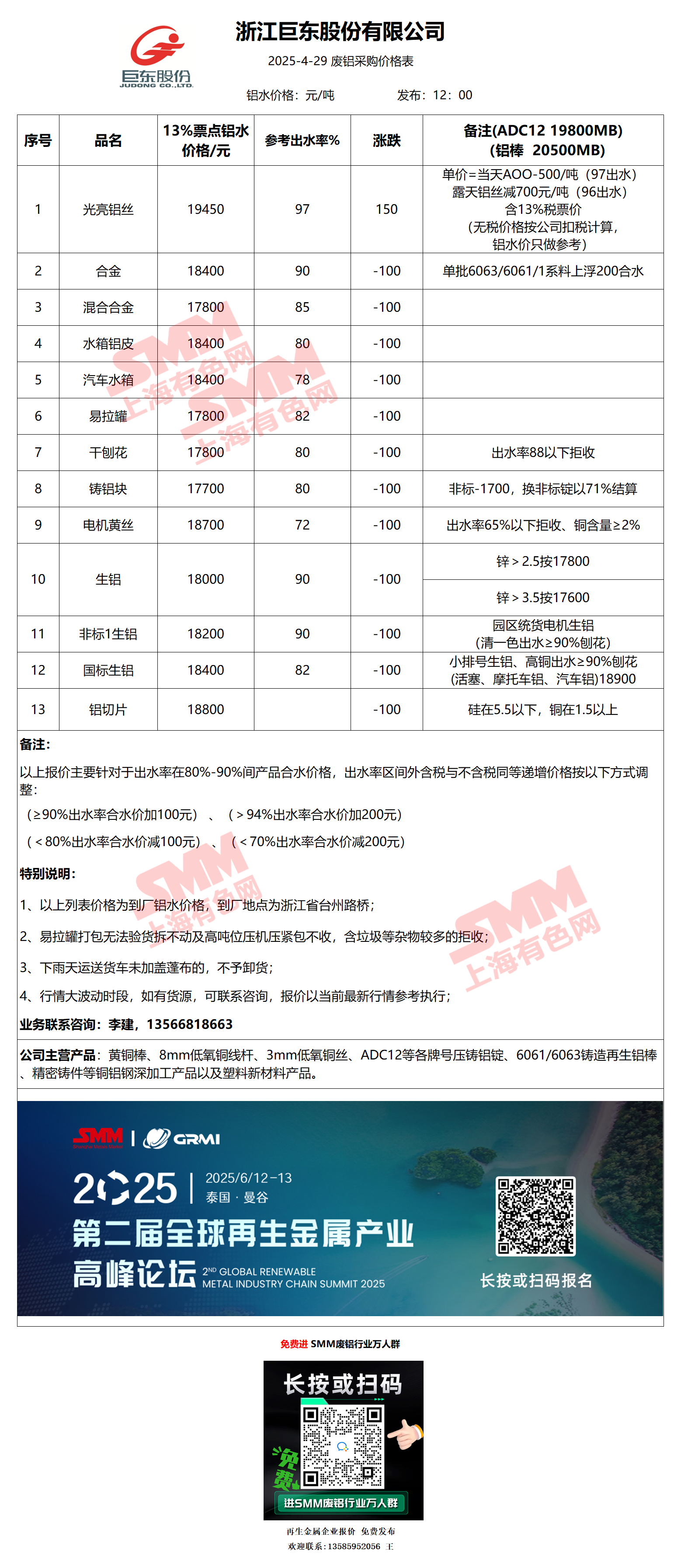 4月29日浙江巨东 废铝采购报价