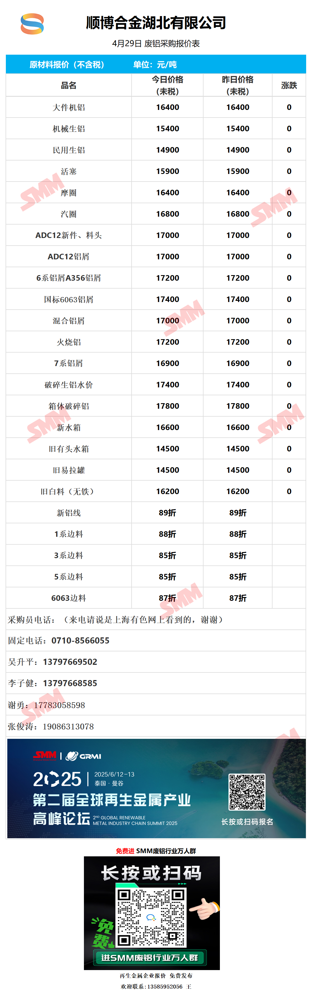 4月29日顺博合金湖北 废铝采购报价