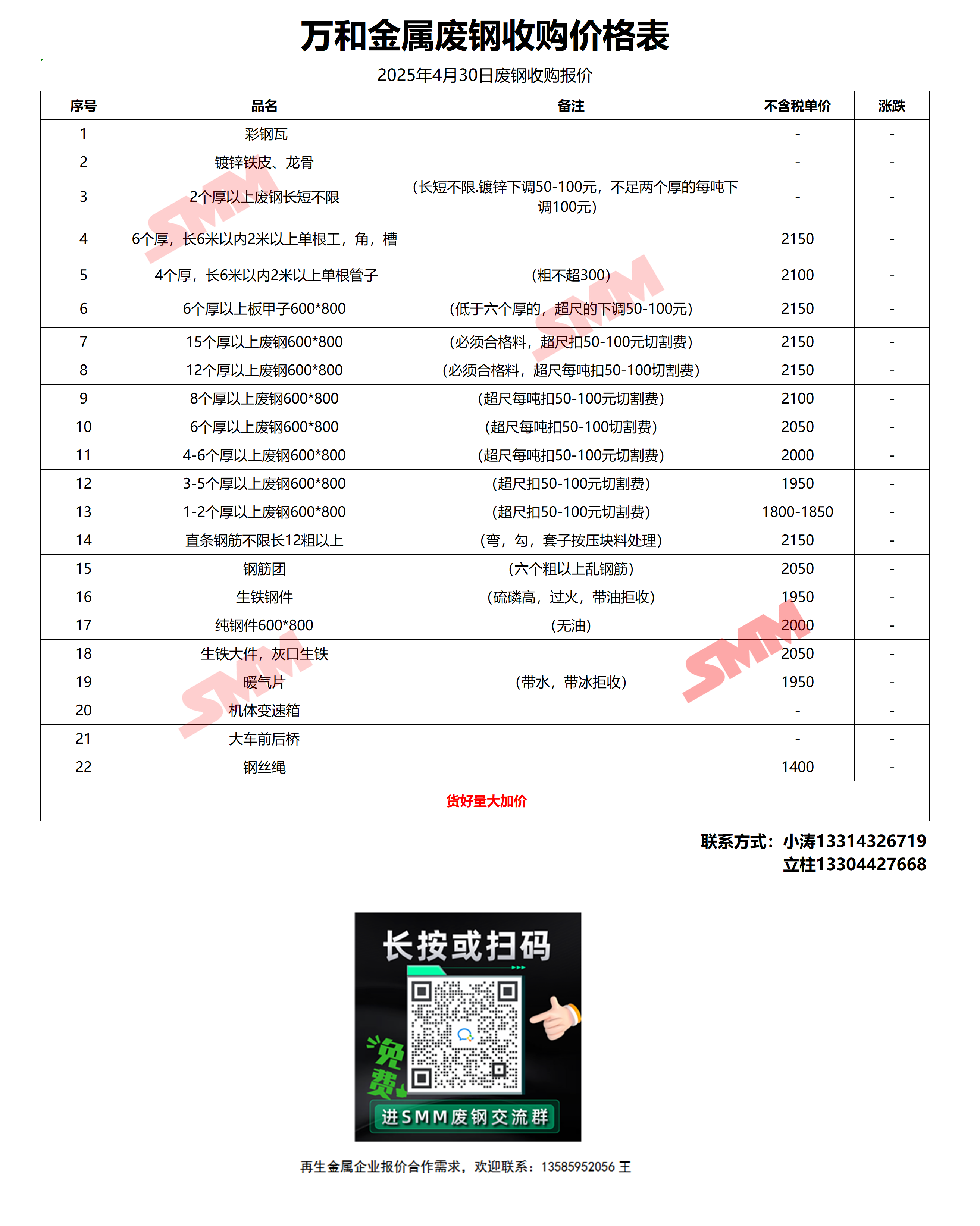 今日万和金属 废钢收购报价已更新,有货的朋友欢迎联系我们!