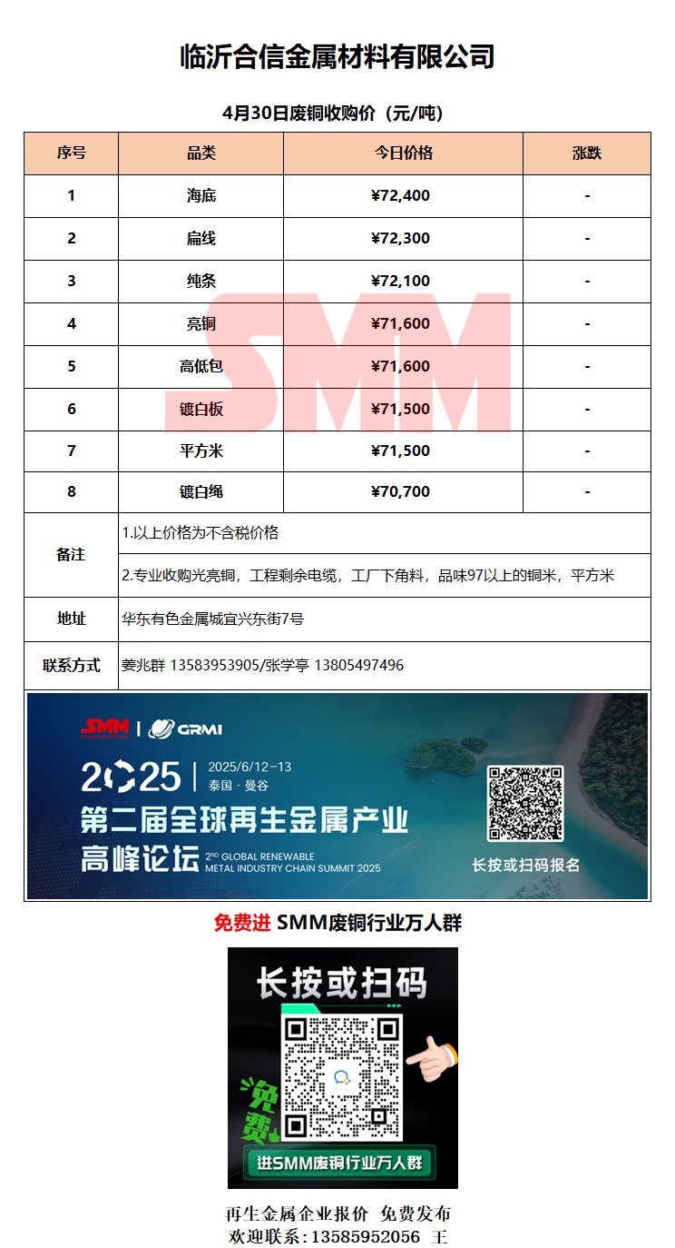 4月30日临沂合信金属 废铜采购报价