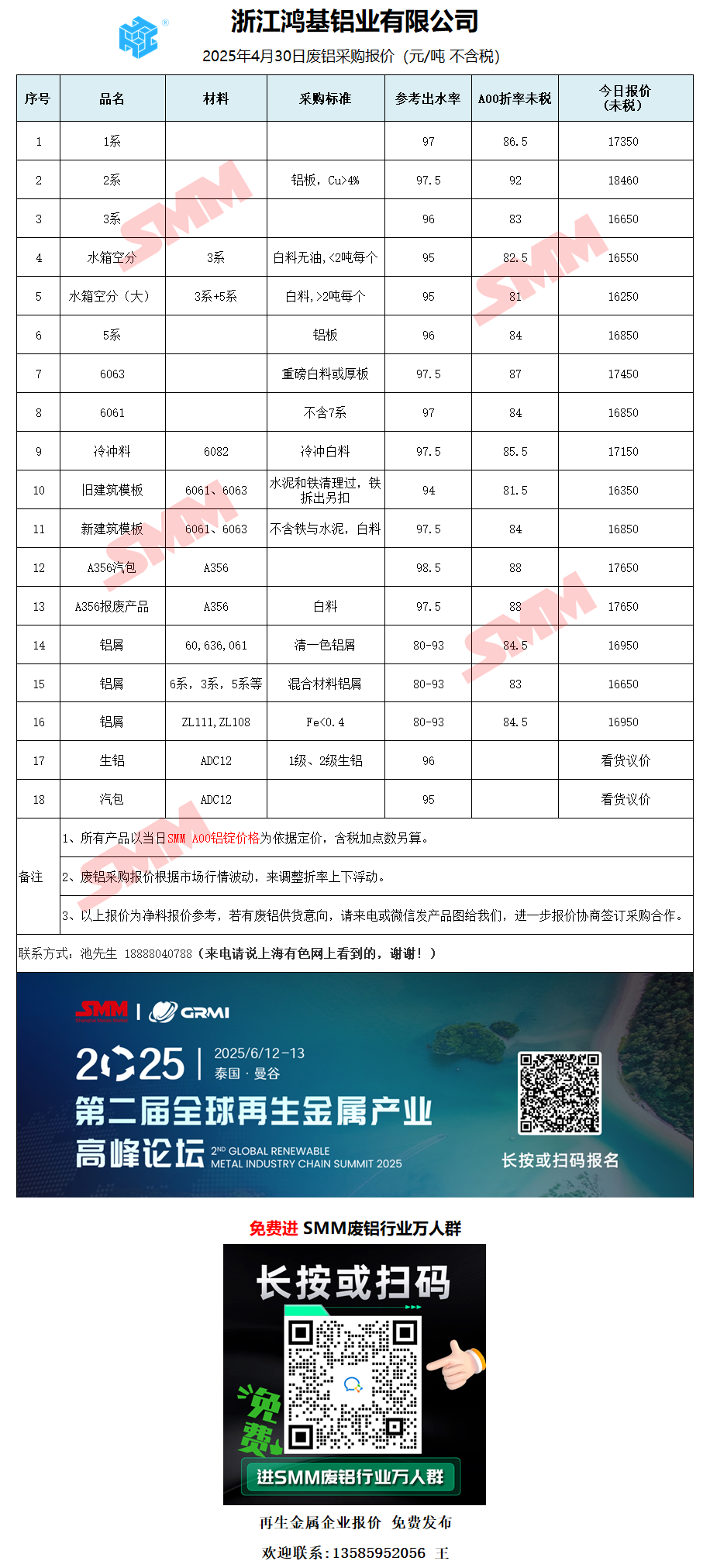 4月30日浙江鸿基铝业 废铝采购报价