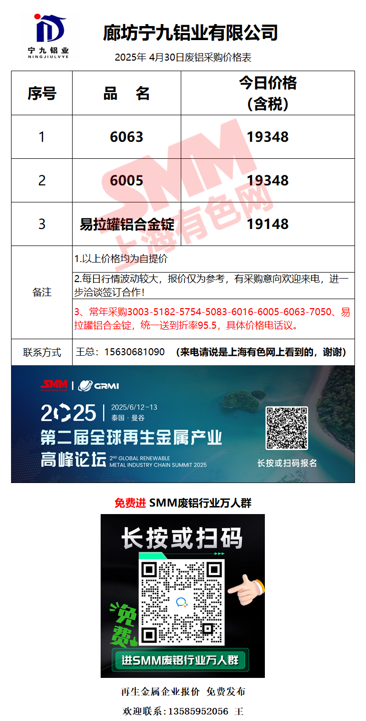 今日宁九铝业 废铝采购报价已更新,有货的朋友欢迎联系我们!