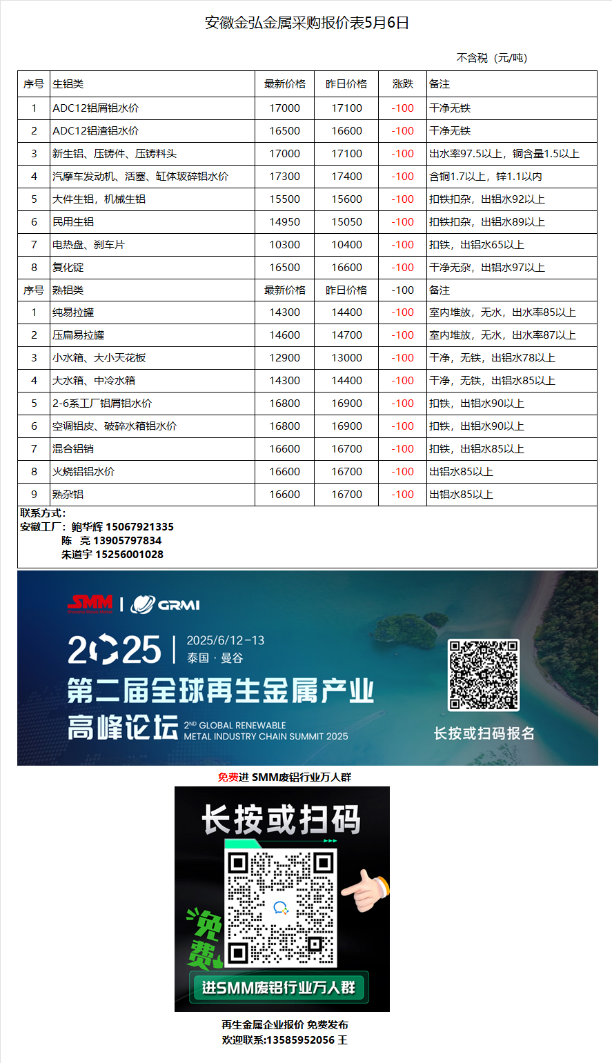 5月6日安徽金弘 废铝采购报价