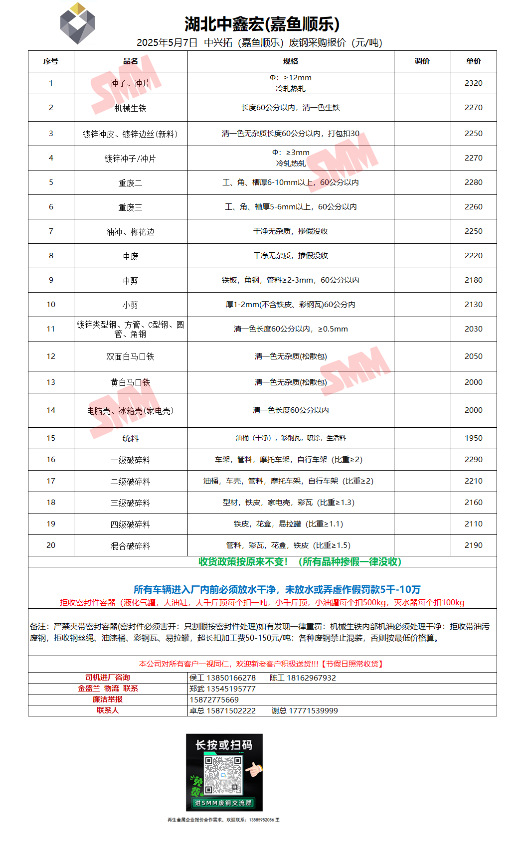 5月7日湖北中鑫宏(嘉鱼顺乐) 废钢采购报价