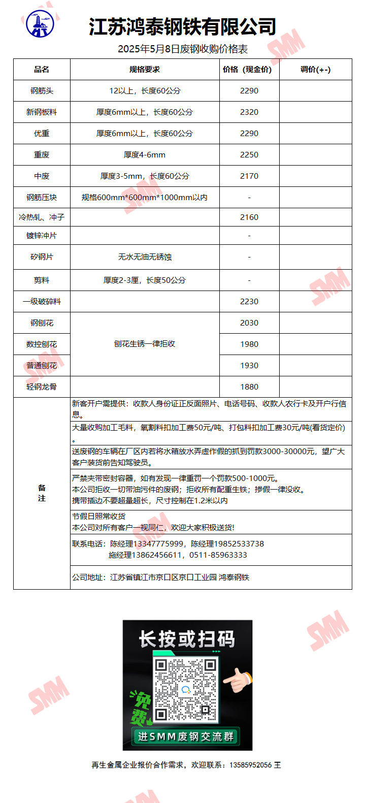 5月8日江苏鸿泰钢铁 废钢收购报价