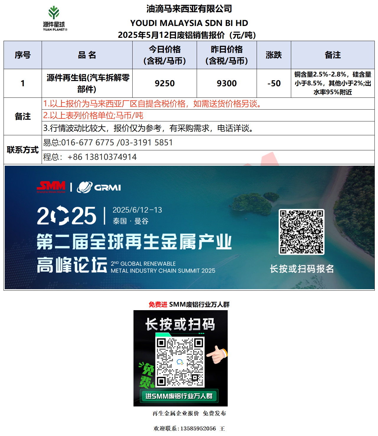 5月12日油滴马来西亚 废铝销售报价