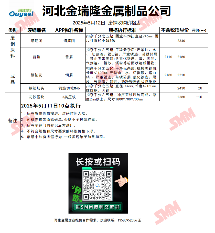 5月12日河北金瑞隆钢铁 废钢收购报价