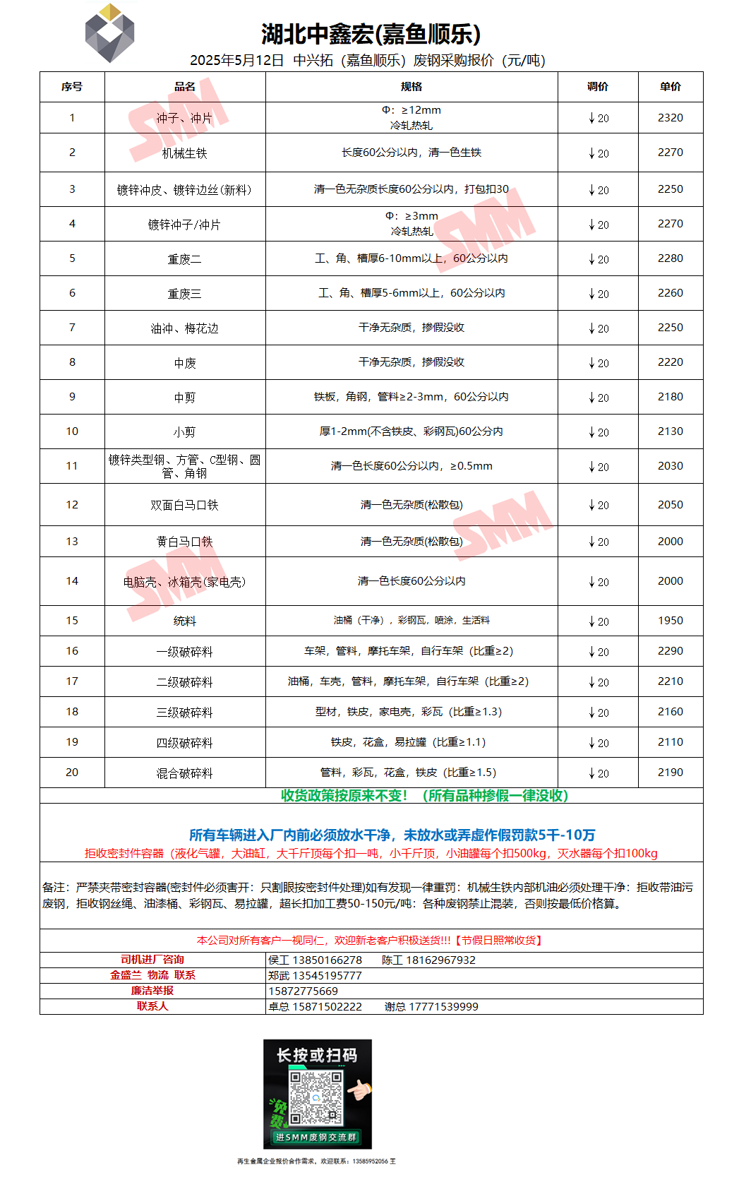 5月12日湖北中鑫宏(嘉鱼顺乐) 废钢采购报价