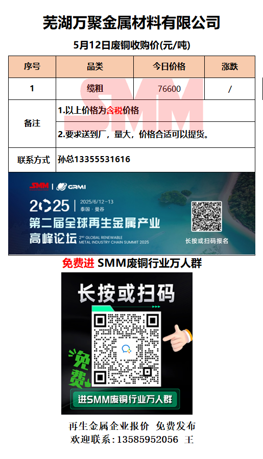 今日芜湖万聚金属 废铜采购报价已更新,有货的朋友欢迎联系我们!