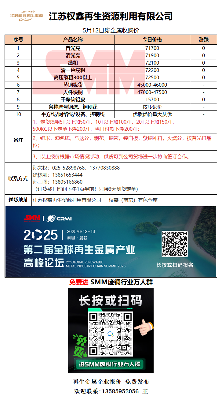 今日江苏权鑫 废铜采购报价已更新,有货的朋友欢迎联系我们!