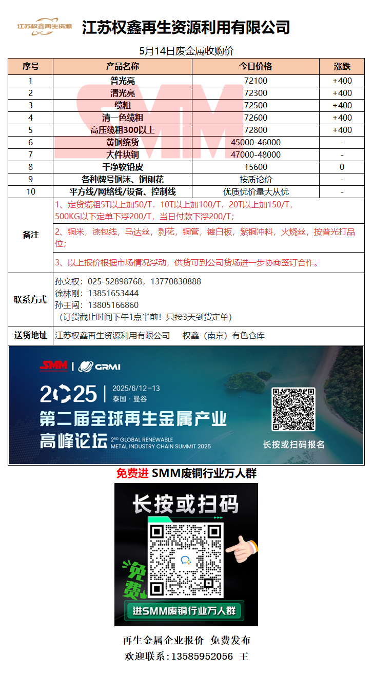 5月14日江苏权鑫 废铜采购报价