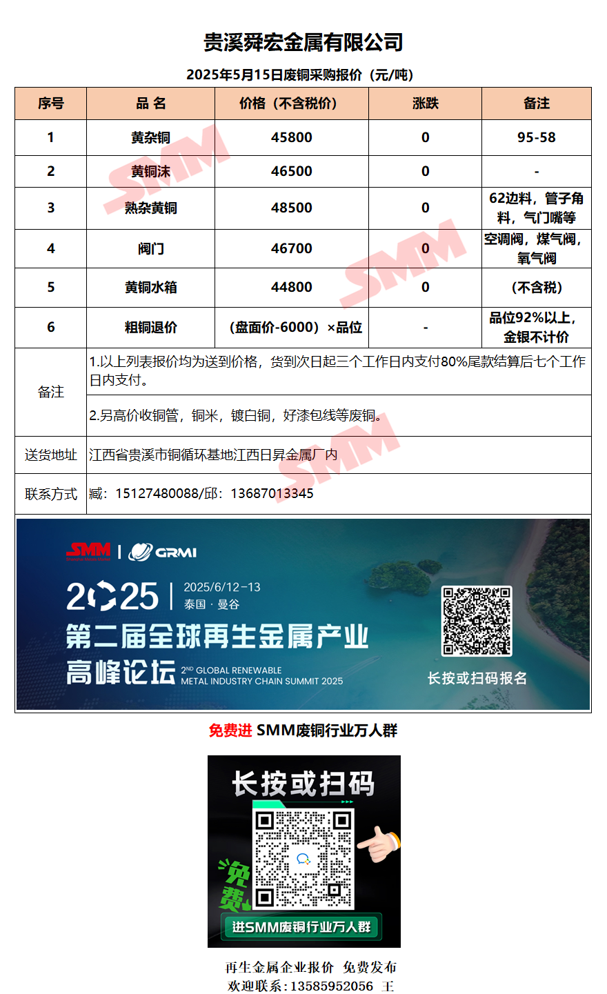 今日贵溪舜宏 废铜采购报价已更新,有货的朋友欢迎联系我们!