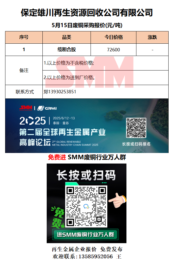 5月15日保定雄川 废铜采购报价