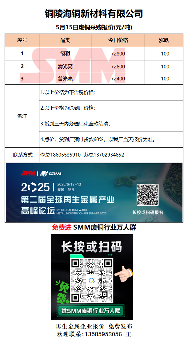 5月15日铜陵海铜 废铜采购报价