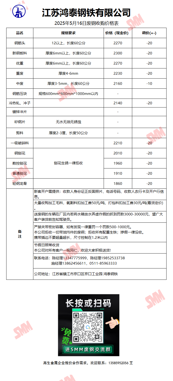 5月16日江苏鸿泰钢铁 废钢收购报价