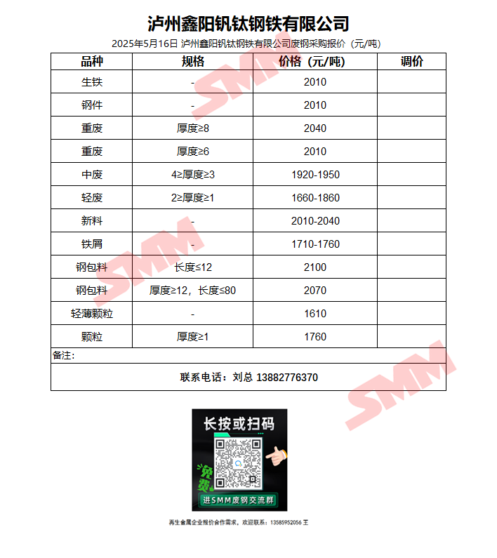5月16日 泸州鑫阳钒钛 废钢采购报价