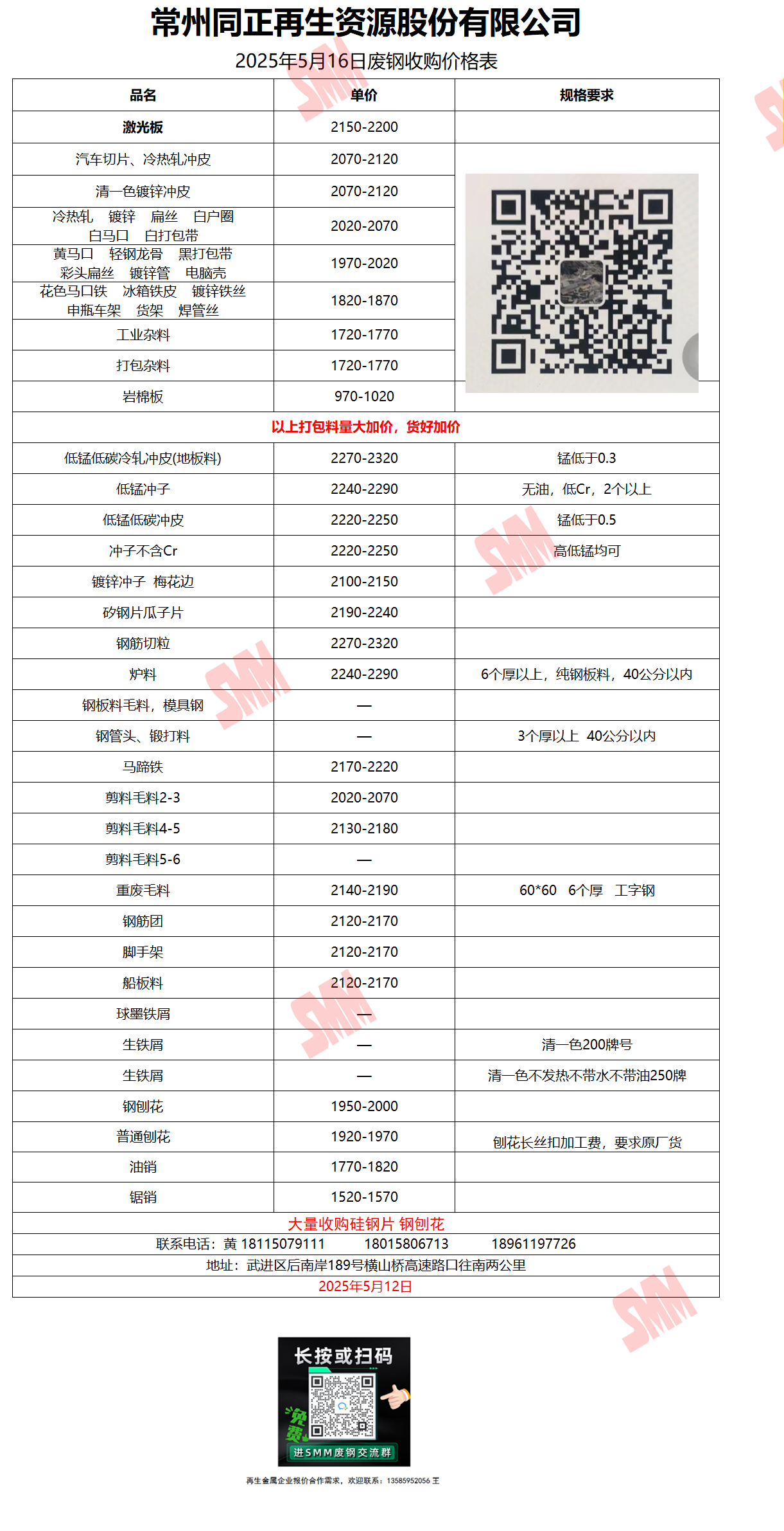 5月16日常州同正再生 废钢收购报价