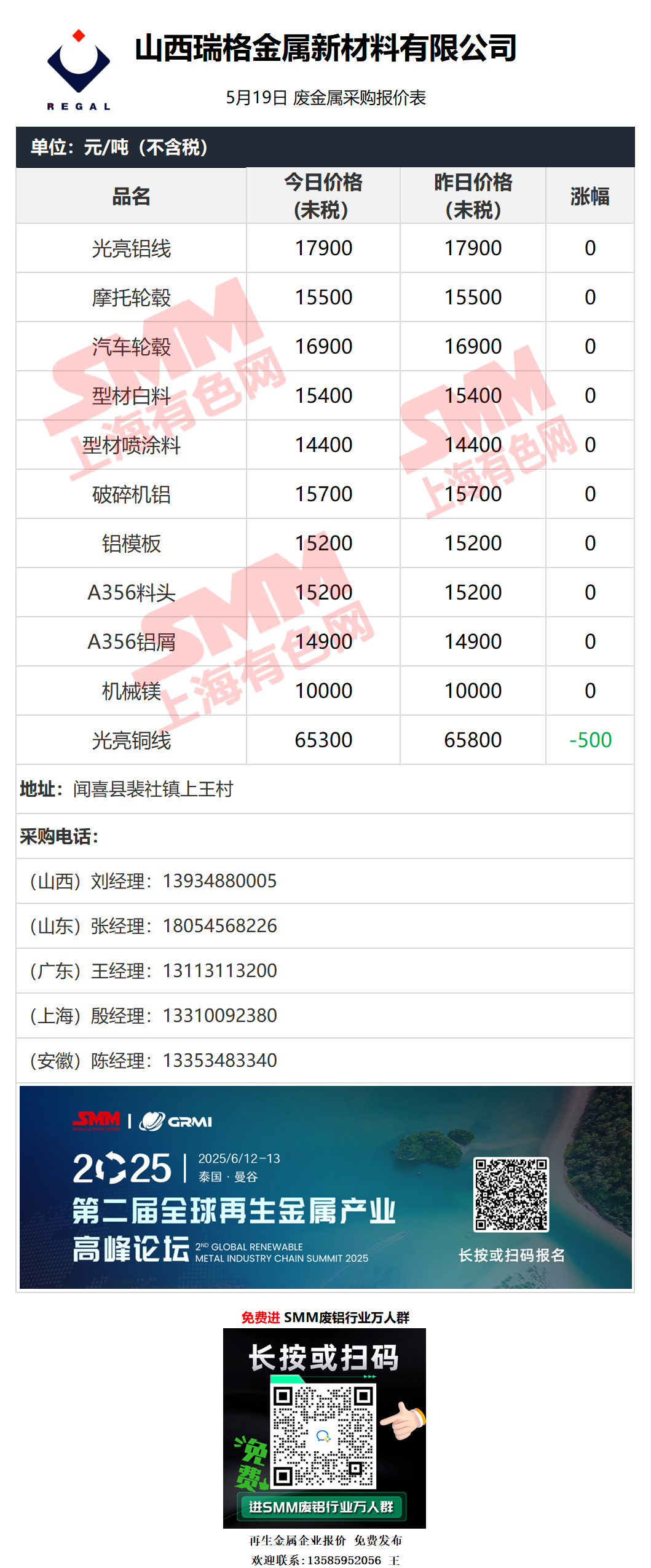 今日瑞格金属 废铝采购报价已更新,有货的朋友欢迎联系我们!