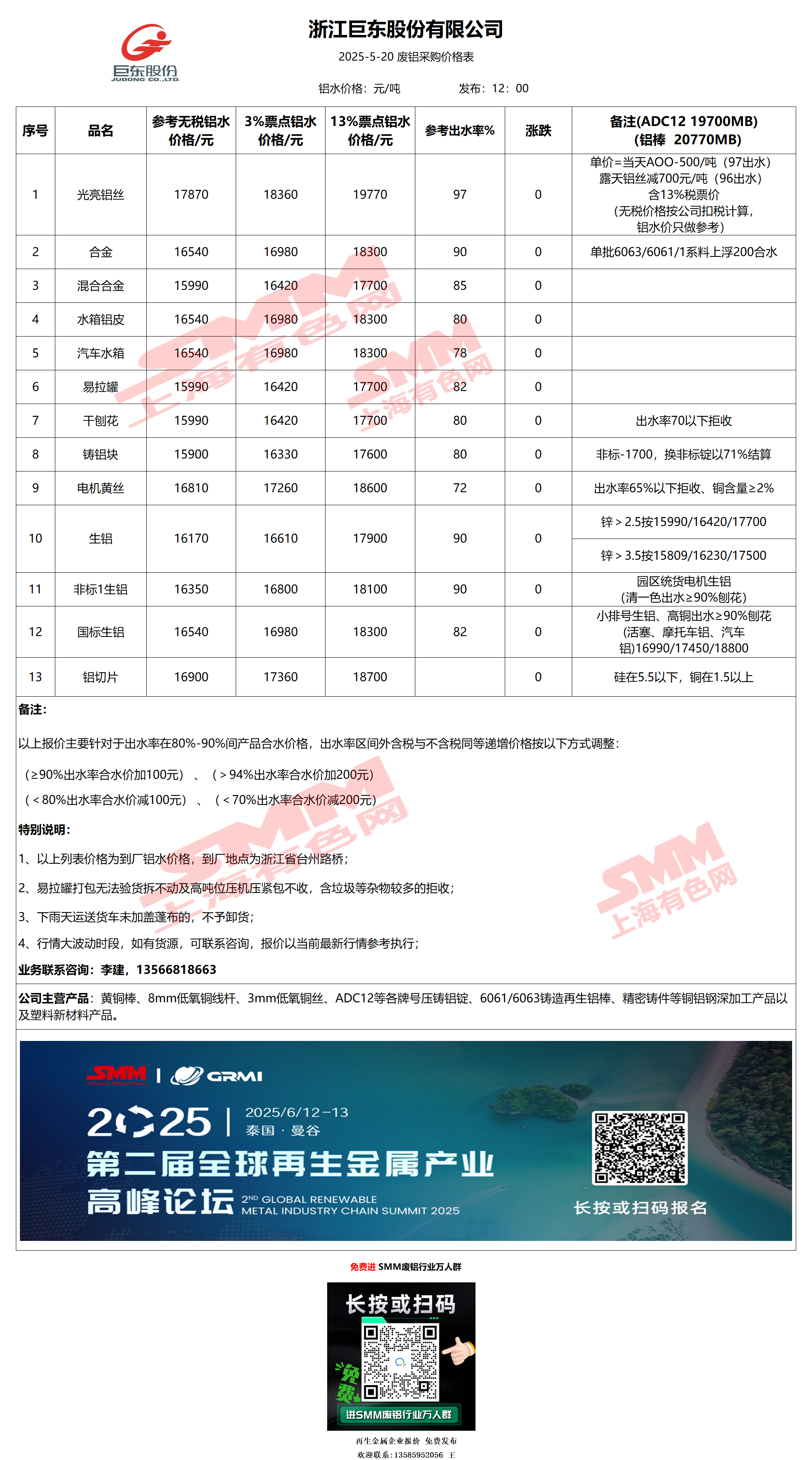 今日浙江巨东 废铝采购报价已更新,有货的朋友欢迎联系我们!