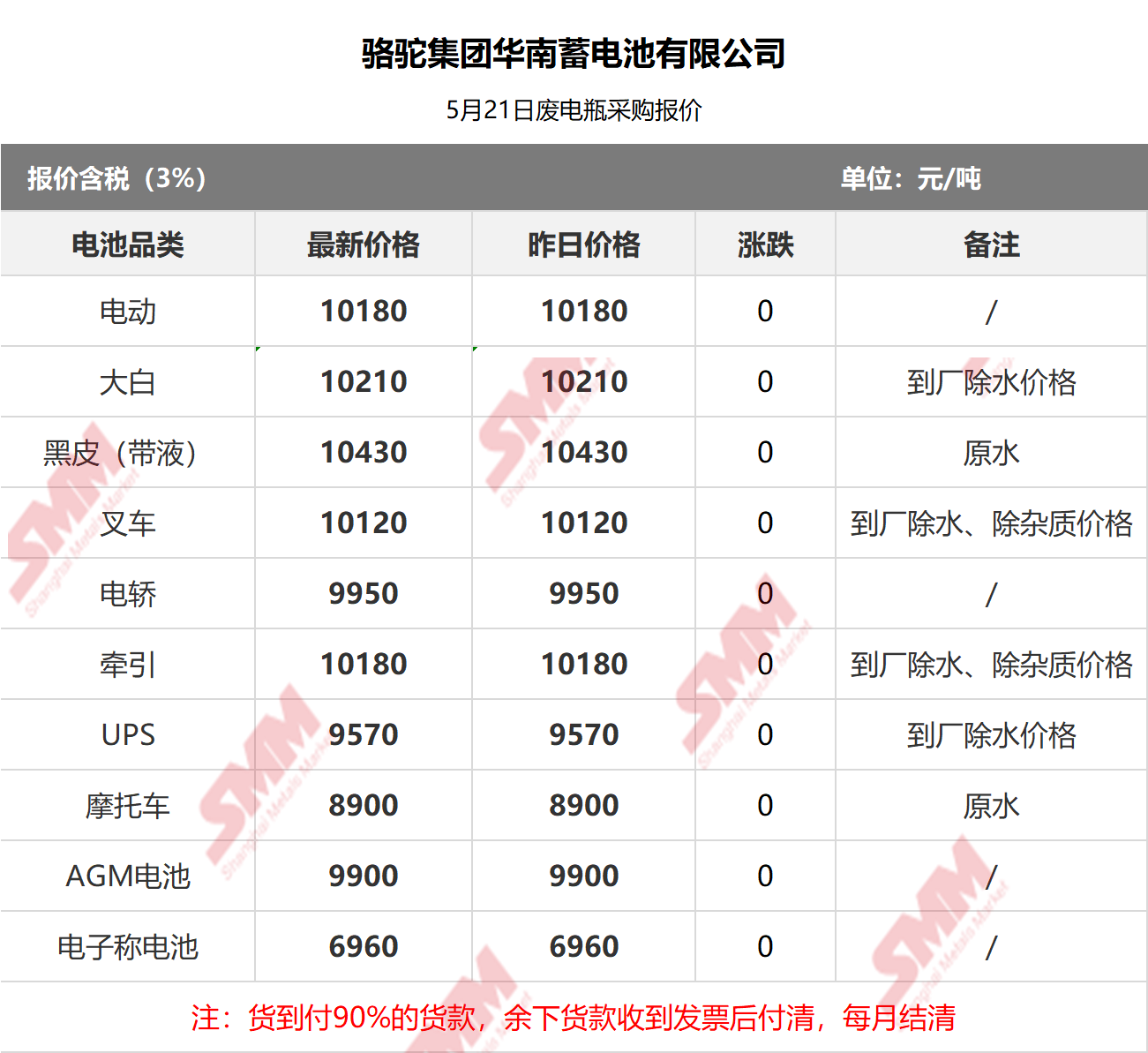 5月21日骆驼华南 废电瓶采购报价