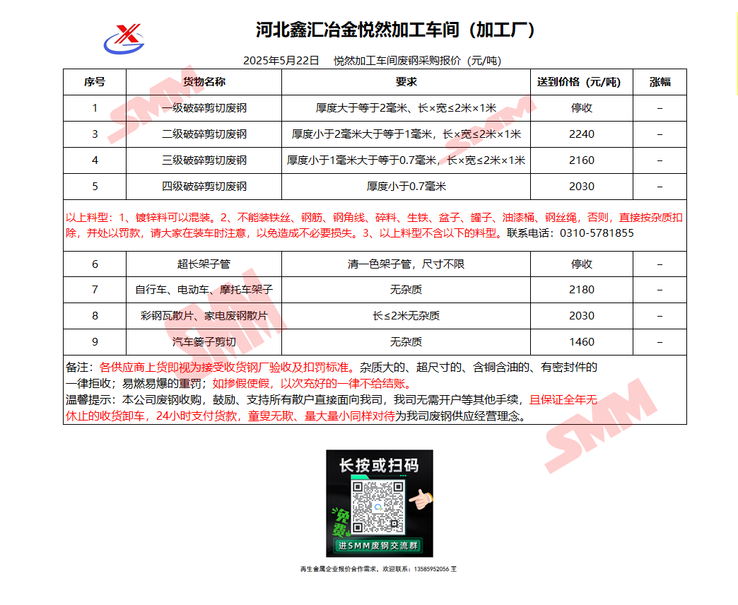5月22日河北鑫汇冶金悦然加工车间 废钢采购报价