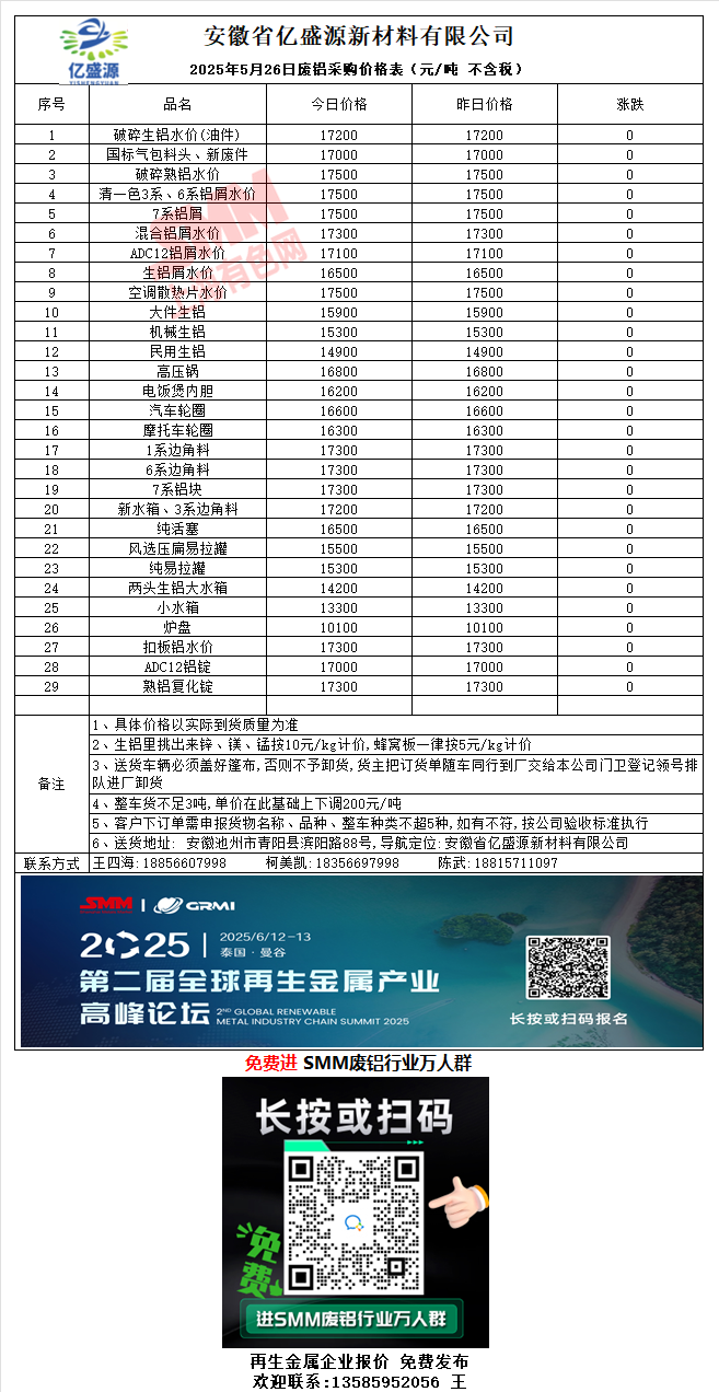 5月26日安徽亿盛源 废铝采购报价