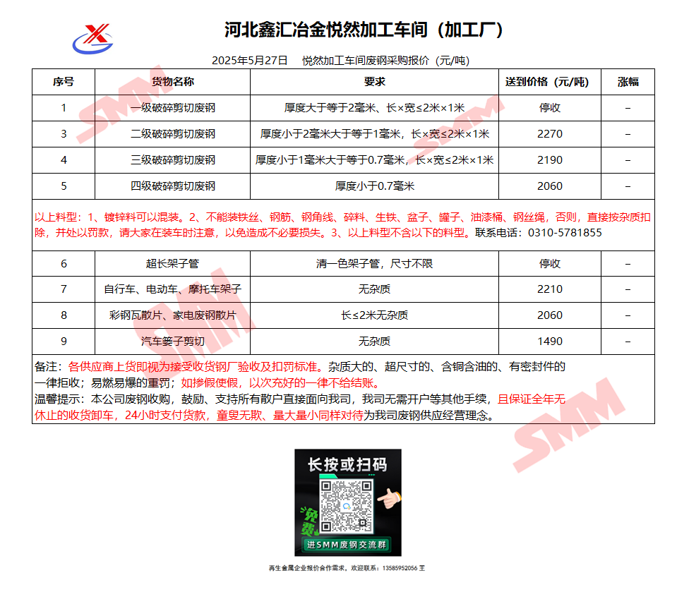 5月27日河北鑫汇冶金悦然加工车间 废钢采购报价