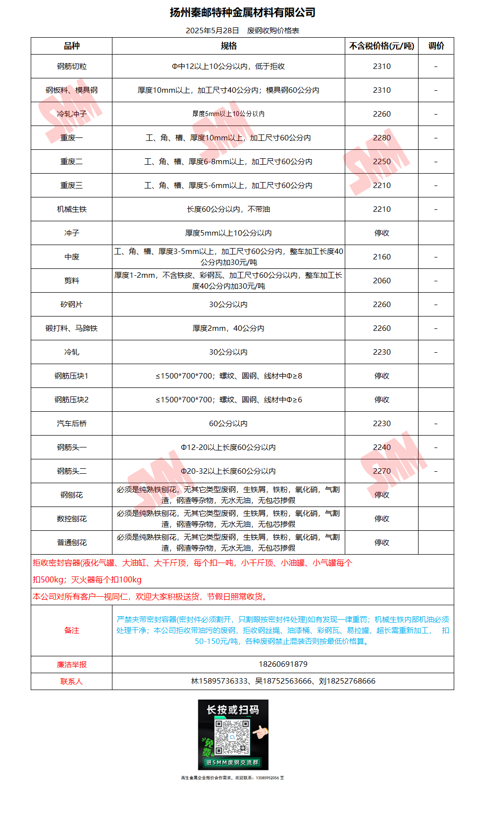 今日秦邮特钢 废钢收购报价已更新,有货的朋友欢迎联系我们!