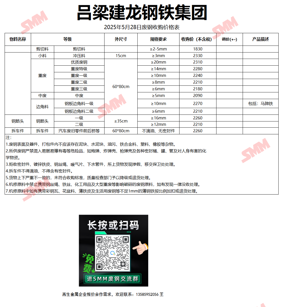5月28日吕梁建龙钢铁 废钢收购报价