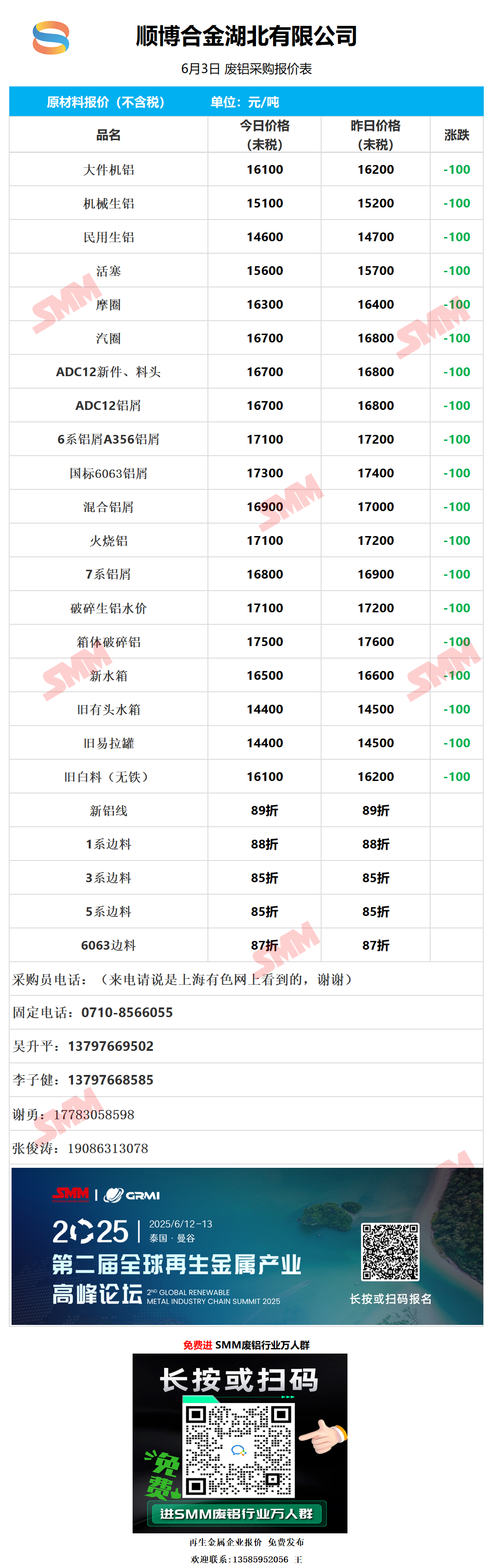 今日顺博合金湖北 废铝采购报价已更新,有货的朋友欢迎联系我们!