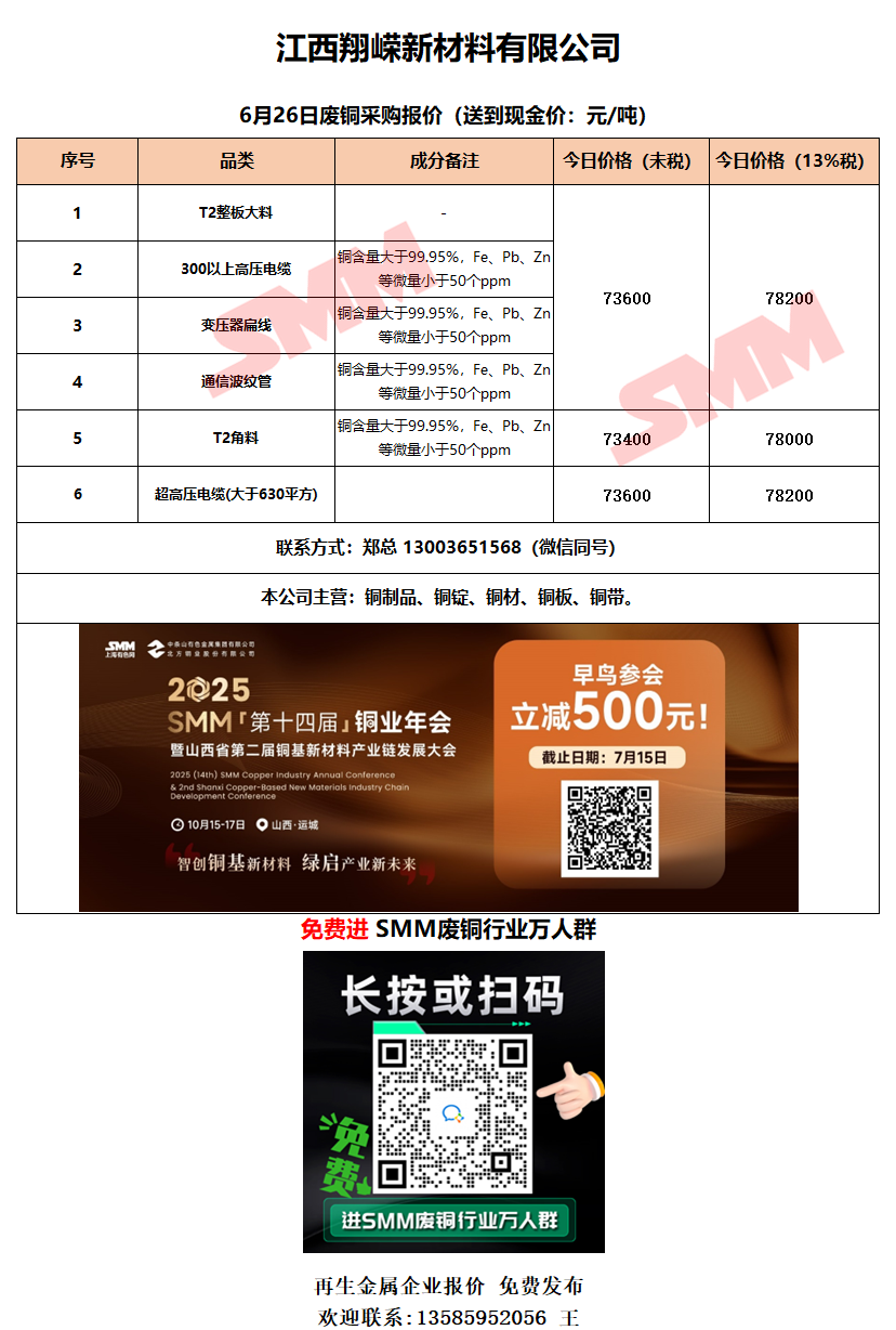 今日江西翔嵘新材料 废铜采购报价已更新,有货的朋友欢迎联系我们!