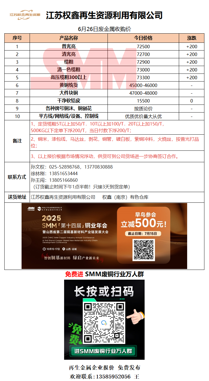 6月26日江苏权鑫 废铜采购报价