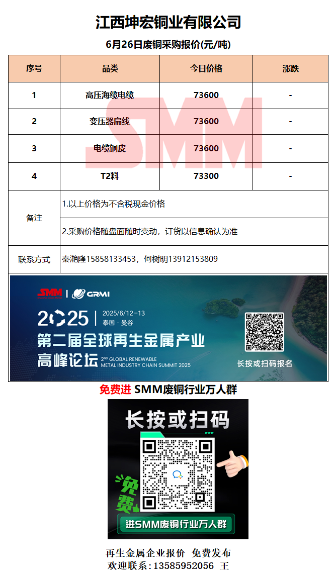 6月26日江西坤宏 废铜采购报价