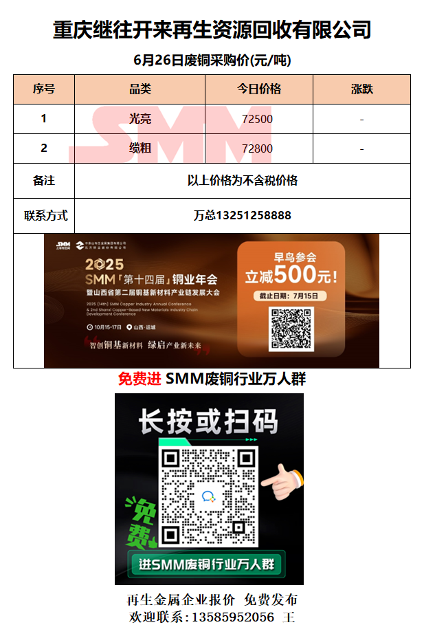 6月26日重庆继往开来 废铜采购报价