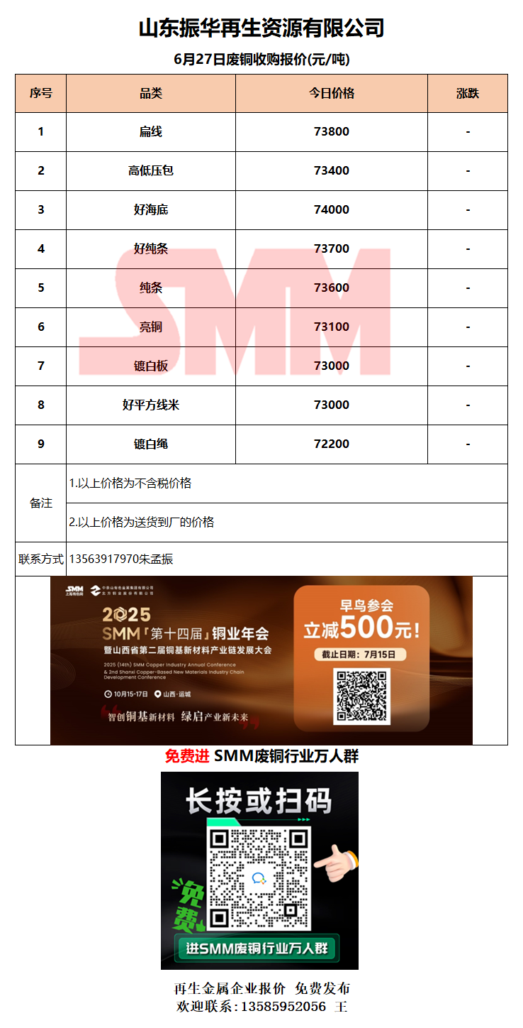 6月27日山东振华 废铜采购报价