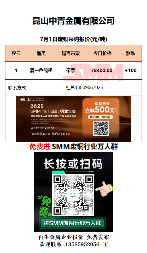 7月1日昆山中青 废铜采购报价