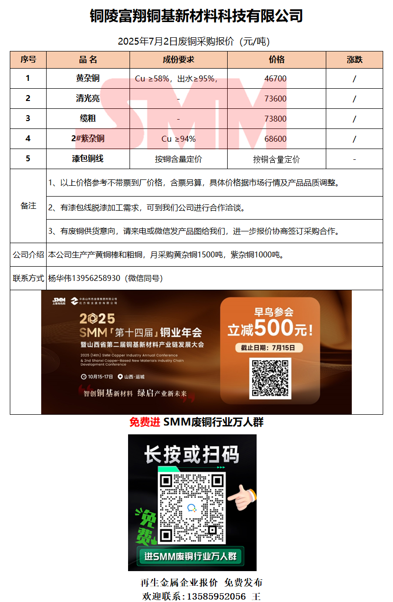 今日铜陵富翔 废铜采购报价已更新,有货的朋友欢迎联系我们!