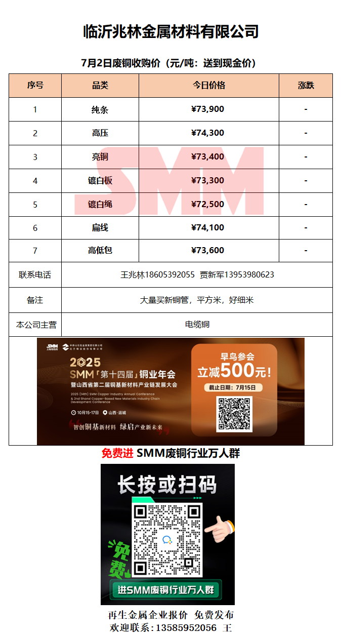 7月2日临沂兆林金属 废铜采购报价