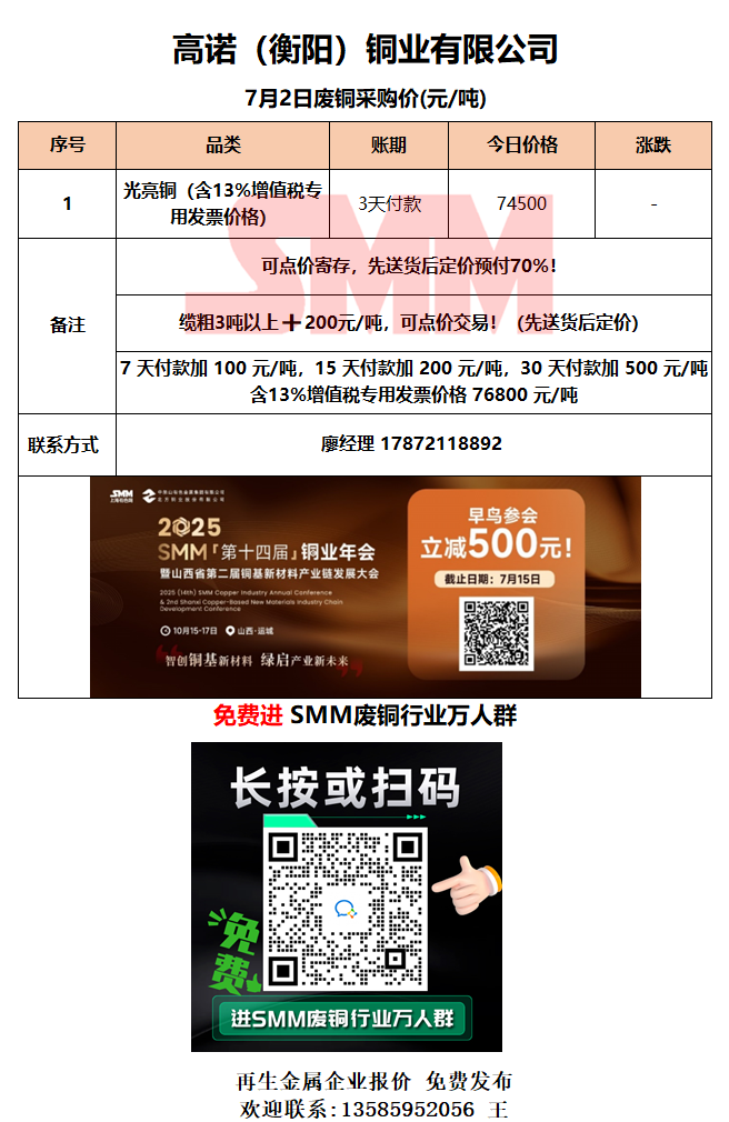 7月2日高诺(衡阳)铜业 废铜采购报价