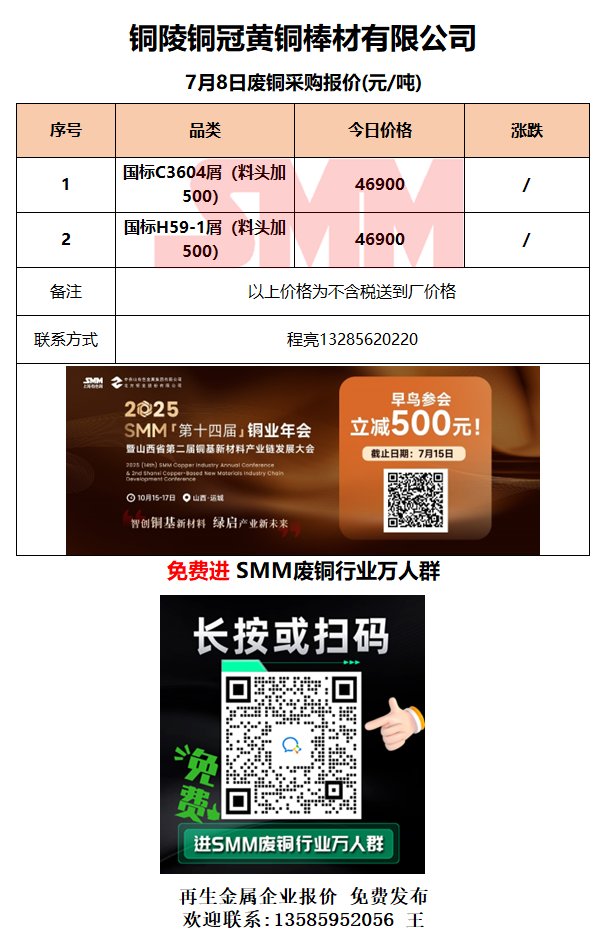 7月8日铜陵铜冠 废铜采购报价